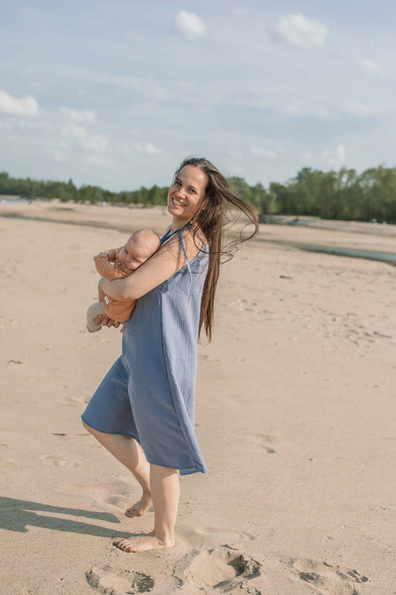 Cudownie zwiewna muślinowa sukienka dla mamy na każdym etapie – od ciążowego brzuszka, po czas połogu, karmienia piersią i spacerów po plaży z maluszkiem za rączkę.